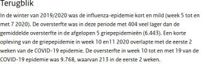 In de winter van 2019/2020 was de influenza-epidemie kort en mild (week 5 tot en met 7 2020). De oversterfte was in deze periode met 404 veel lager dan de gemiddelde oversterfte in de afgelopen 5 griepepidemieën (6.443).