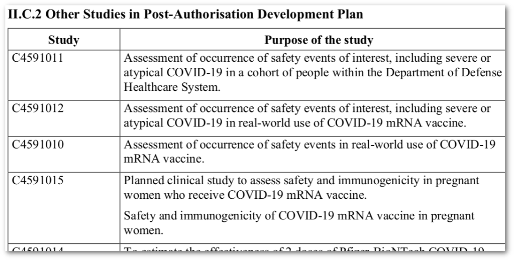 De vaccins van Moderna, Pfizer–BioNTech en Janssen bevinden zich nog in de onderzoeksfase, namelijk in fase 3 die eindigt voor Moderna in oktober 2022, voor Pfizer-BioNTech in mei 2023. en voor Janssen in januari 2022. Dit betekent dat elke gevaccineerde aan dit onderzoek deelneemt als proefpersoon.