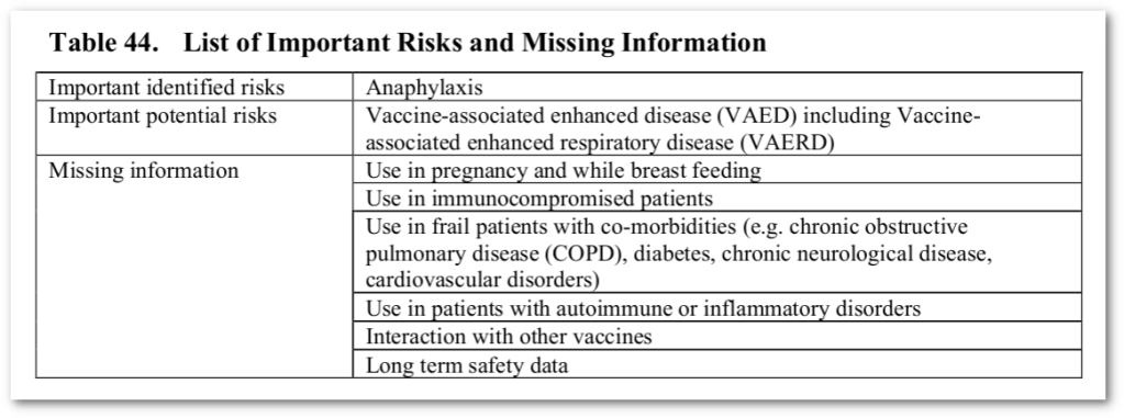 | Belangrijke potentiële risico’s | Vaccin-geassocieerde versterkte ziekte (VAED), inclusief vaccin-geassocieerde versterkte ziekte van de luchtwegen (VAERD) |