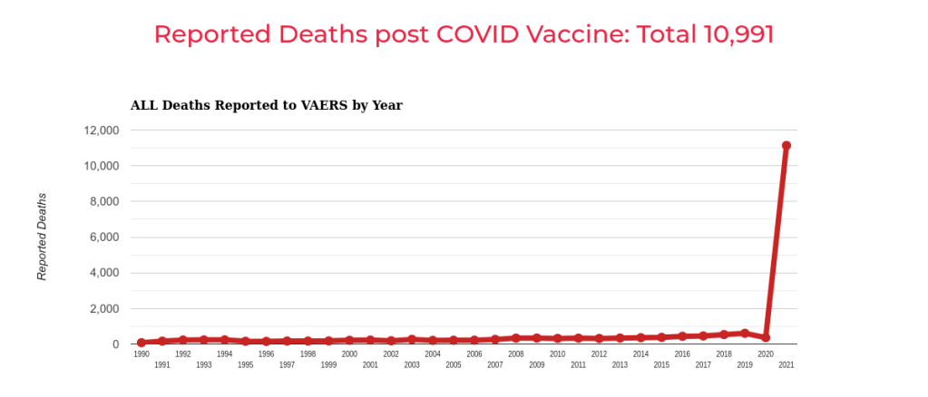 Volgens de gegevens van VAERS van 13 juni 2021 is het aantal gerapporteerde sterfgevallen na de COVID vaccins groter dan het gecombineerde aantal gerapporteerde sterfgevallen door andere vaccins in de afgelopen 30 jaar . In die tijd zijn meer dan 4 miljard dosissen gegeven.