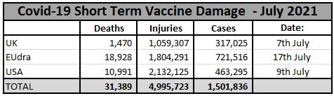 Tabel: Cijfers VAERS, Yellow Card en EudraVigilance gecombineerd