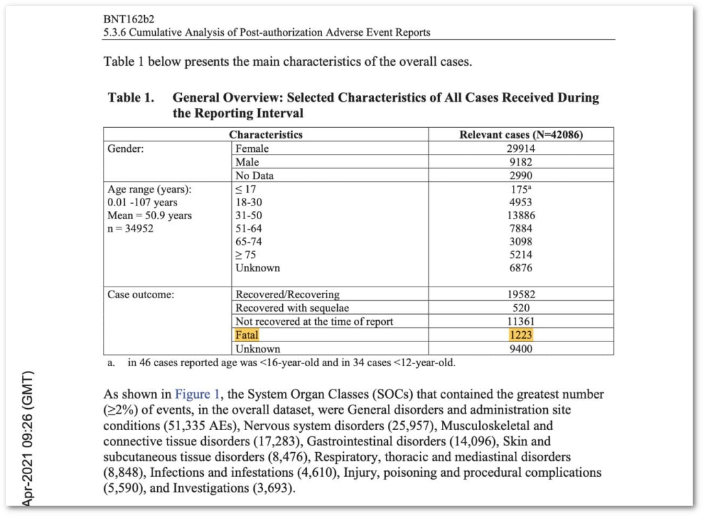 Volgens vertrouwelijke documenten die via de rechter zijn verkregen, rapporteerde Pfizer op 28 februari 2021, 3 maanden na aanvang van de vaccinatiecampagne, aan de FDA 1.223 sterfgevallen.