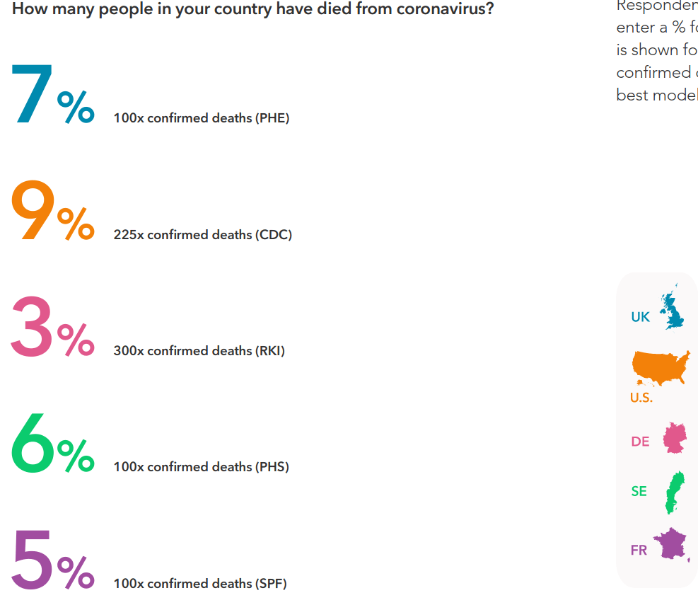 Een enquête van een Amerikaans onderzoeksbureau van juli 2020 suggereert dat mensen het percentage mensen gestorven aan COVID-19 100 tot 300 keer te hoog inschatten.