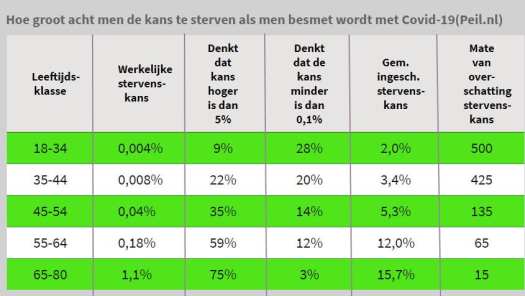 Bij mensen tussen 55 en 64 jaar geloofden 50 procent in dat sterftecijfer en bij mensen tussen 65 en 80 jaar 60 procent.