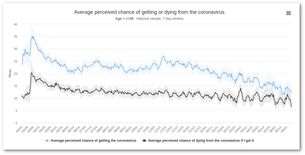In enquêtes die regelmatig door de universiteit van Zuid-Californië worden gehouden, schatten Amerikanen onder de 40 jaar hun kans om te sterven als zij het virus oplopen steevast op ongeveer 10%, een 1000-voudige overschatting voor die leeftijdsgroep.